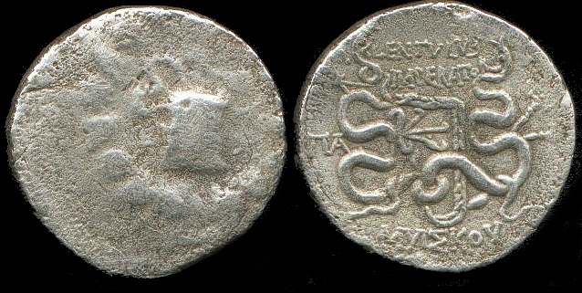 | Apameia --AR Cistophoric Tetradrachm. Serpent crawling from cista/Snakes around bow case, trident to right.