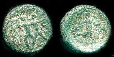 Etenna -AE 14. Two male figures standing left, one holds bipennis, other a curved knife/Female advancing left, holding snake, oenochoe to right.