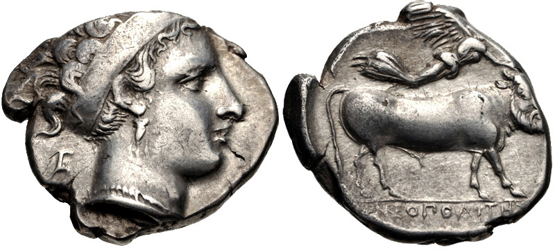 Neapolis -- AR Nomos. 350-325 BC. AR Nomos (20mm, 7.48 g, 5h). Head of nymph right; E behind / Man-headed bull walking right; above, Nike flying right, placing wreath on bull's head. Sambon 365; HN Italy 565.