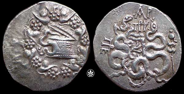 | Pergamon --AR Cistophoric tetradrachm. Cista mystica with serpent/Bowcase with serpents, serpent staff to right, city legend to left. MH at top.