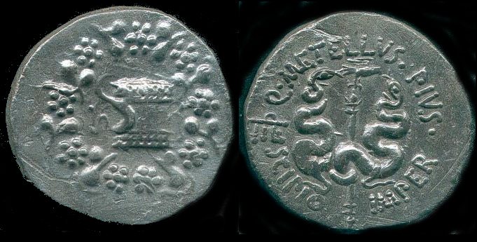 | Pergamon --Q. Metellus Pius Scipio, Imperator. 49 BC. AR Cistophoric Tetradrachm (11.81 gm). Serpent crawling from basket (cista) / Q.METELLVS PIVS SCIPIO IMPER, serpents entwined around legionary aquila; monogram. BMC Mysia pg. 126, 128; CNR Caecilia 75