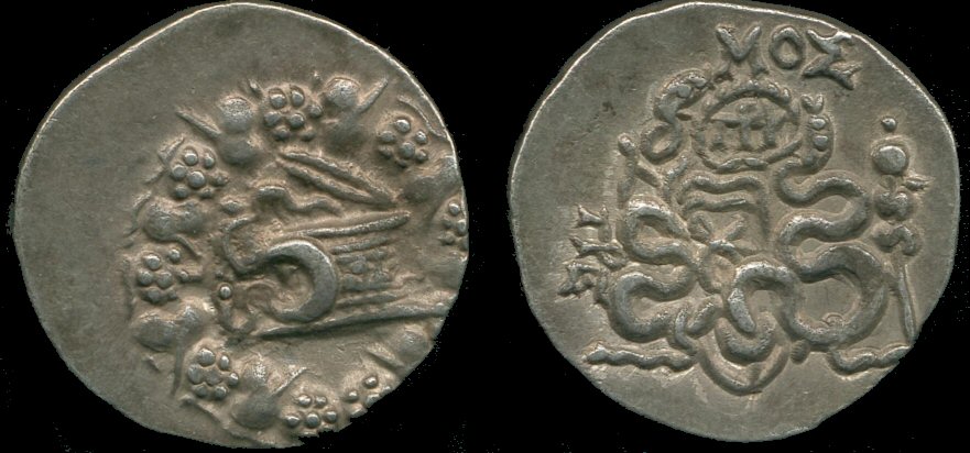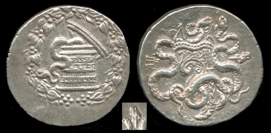 | Pergamon --AR Cistophoric Tetradrachm. Cista Mystica/Bow-case and serpents. City mark left, owl on grapes to right. K-Noe -, Same obverse die as CNG 57, lot 390.