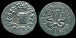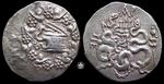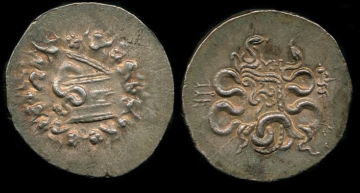 | Pergamon --AR Cistophoric tetradrachm. Circa 76-67 BC. Cista mystica with serpent; all within ivy wreath / Bow-case with serpents; MOS and a monogram within a wreath above, thyrsos right. Kleiner, Pergamum 45; Pinder 124.