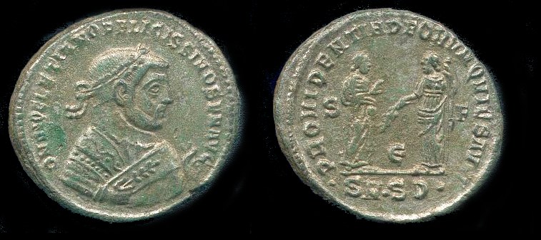 Diocletian --AE Post abdication Follis. D.N. DIOCLETIANO BEATISSIMO SEN. AUG. diademed bust right, wearing imperial mantle, holding branch and mappa. Reverse : PROVIDENTIA DEORUM QUIES AUGG. Quies and Providence stg. facing each other.