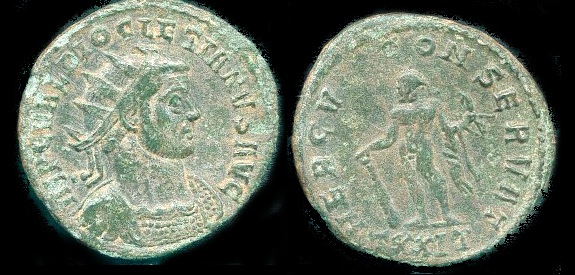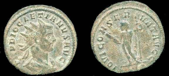 Diocletian --AE Antoninianus. R: Jupiter standing L with spear and thunderbolt. Sear 3516.