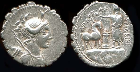 A. Postumius A.f. Sp.n. Albinus --AR Serrate denarius. Draped bust of Diana right; bow and quiver over shoulder, bucranium above / A POSTA AF S N ALBIN,Togate figure standing left on a rock before a lighted altar; ox standing right about to be sacrificed. Crawford 372/1; Sydenham 745; Postumia 7