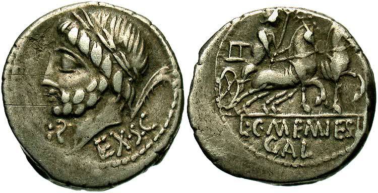 L. and C. Memmius L. f. Galeria --AR Denarius. Laureate head of Saturn left; :S(retrograde) before, EX. S. C. and harpa behind / Venus in biga right, Cupid flying above with laurel wreath; L. C. MEMIES. L. [F.]/GAL. in two lines in exergue. Crawford 349/1; Sydenham 712; Memmia 8