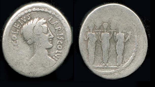P. Accoleius Lariscolus --AR denarius. Head of Acca Larentia / 3 statues of the Nymphae Querquentulanae supporting beam with five trees. Syd 1148.