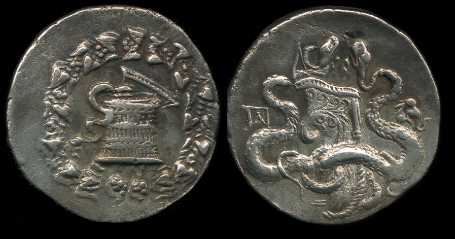 | Apameia - AR Cistophoric Tetradrachm. Snake emerging from a cista; all within an ivy-wreath. / Two coiled serpents with heads erect; between them a bowcase ornamented with a floral scroll like an aplustre, elephant's head above. BMC 5. Overstruck on another issue.