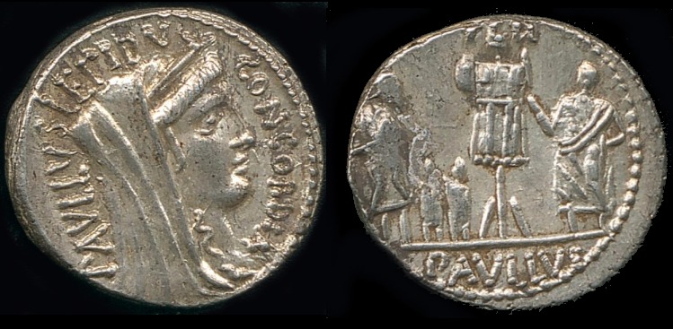 L. Aemilius Lepidus Paullus --AR Denarius. Head of Concordia R/L. Aemilius Paullus standing to right of trophy, Perseus and his two sons captive on the left; TER above, PAVLLVS in exergue. Crawford 415/1; Sydenham 926; Aemilia 10